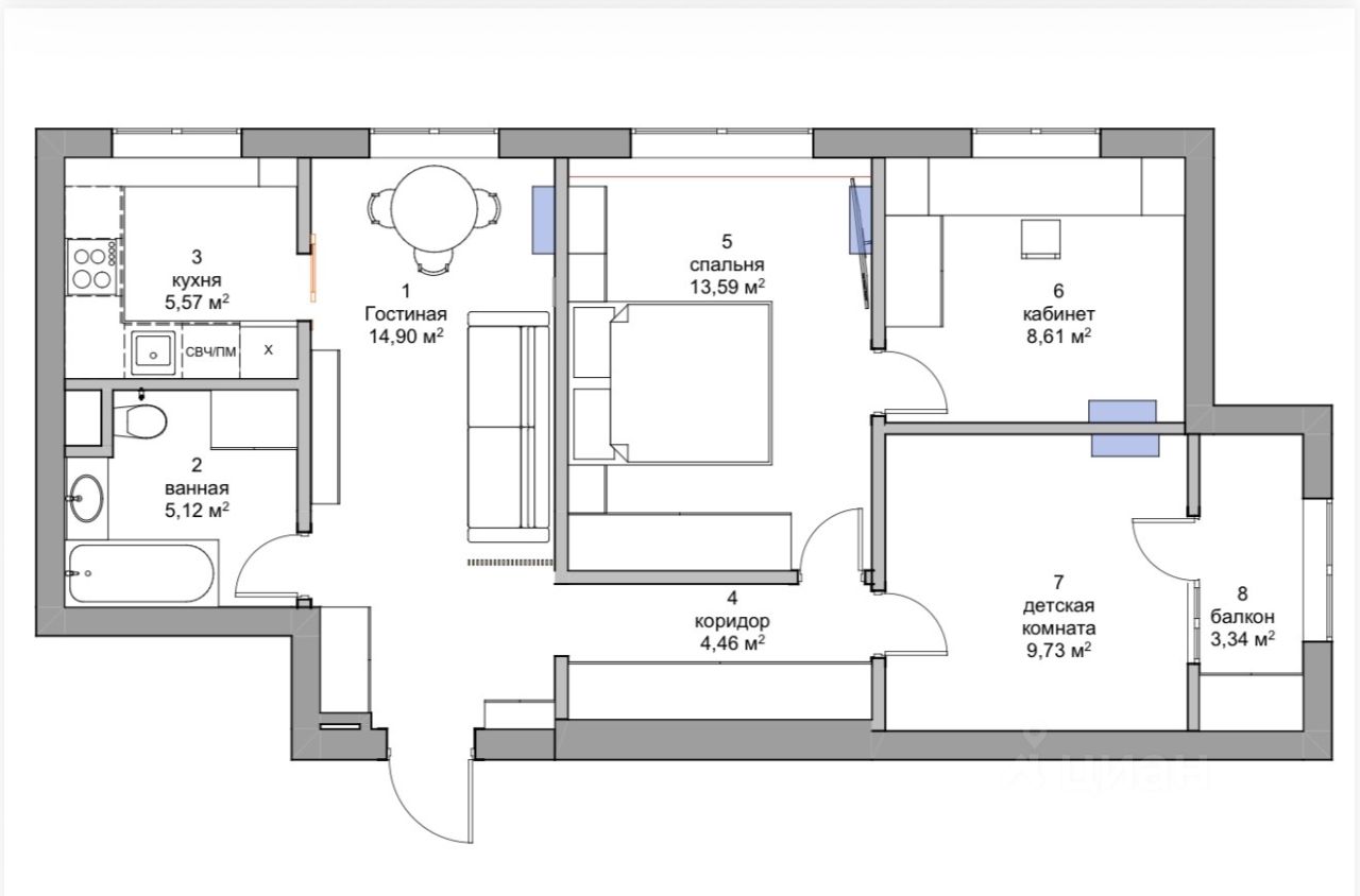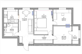 - Три спальни: одна изолированная и две смежные — можно использовать как спальню + кабинет, две детские, спорткомнату и т.д.