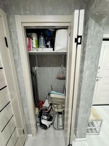 Также в квартире предусмотрен встроенный шкаф для хранения бытовых вещей — от пылесоса до чемоданов — имеет своё место и не мешает повседневной жизни. Функциональность конструкции позволяет содержать дом в идеальной чистоте, не перегружая пространство.