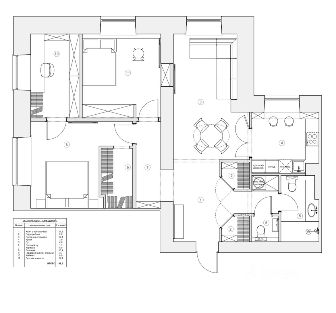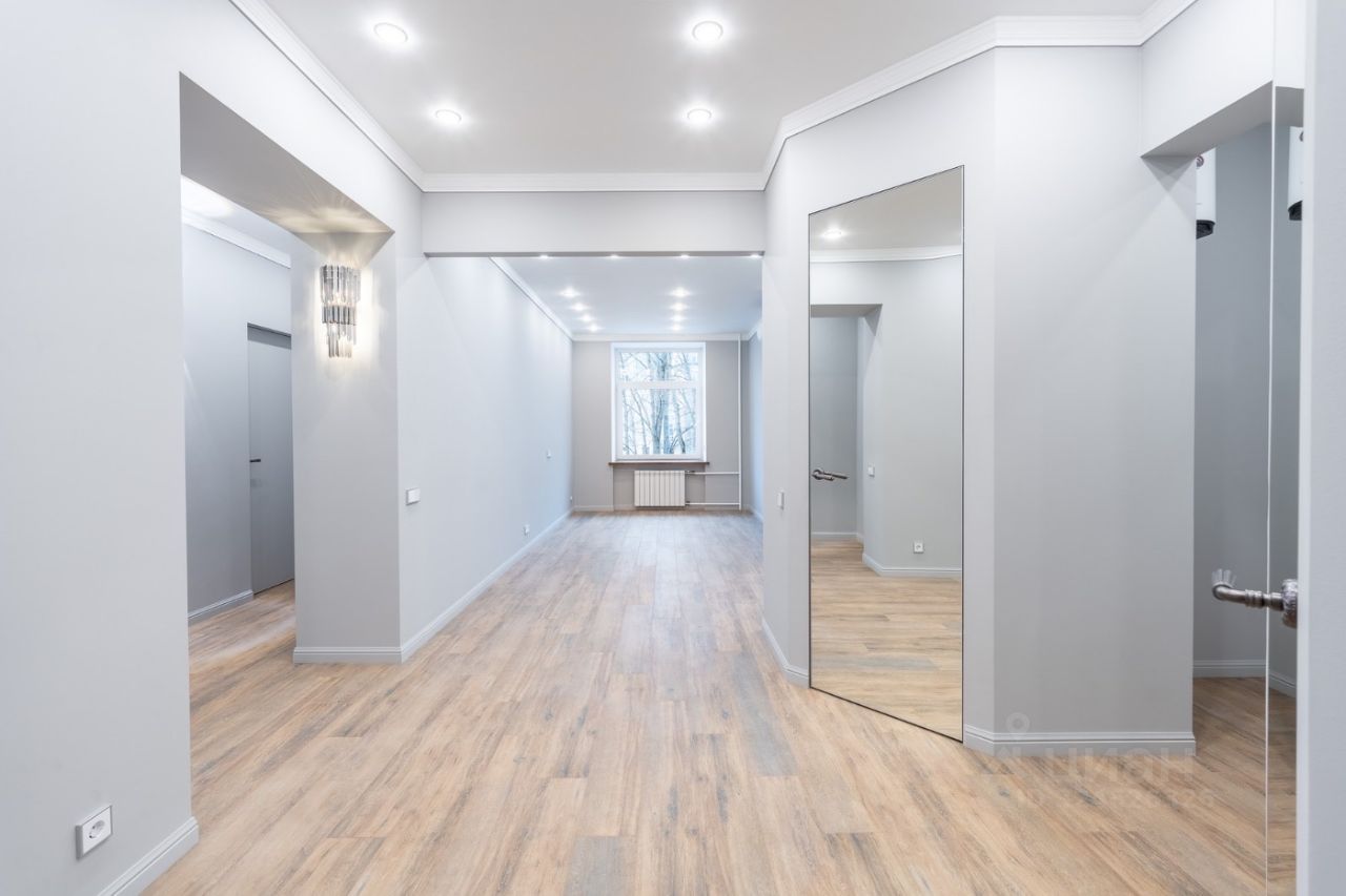 Удобная вместительная кухня, просторная гостиная, две спальни, кабинет, два санузла, один из которых с большой душевой, две гардеробные, много света, пять окон. Вид на красивый зеленый двор.