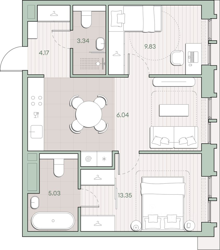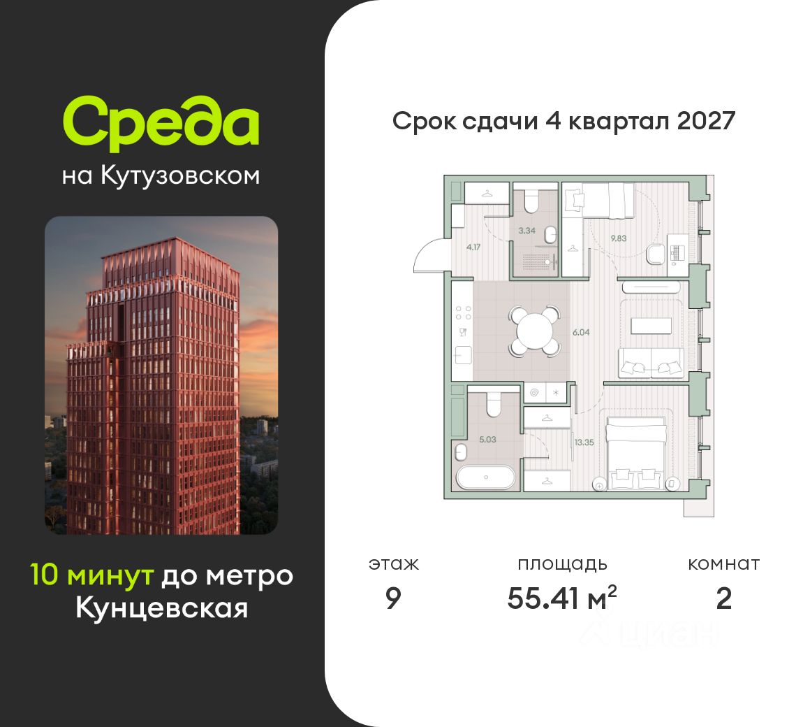 Продаётся 2-комнатная квартира общей площадью 55.41 кв.м. без отделки. Квартира расположена на 9 этаже корпуса 4.2 в жилом комплексе бизнес-класса "Среда на Кутузовском" в пешей доступности от метро "Кунцевская".