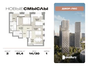 В жилом комплексе, расположенном по соседству с ландшафтным парком "Южное Бутово", продается 2-комнатная квартира площадью 61.40 кв. м. без отделки. Квартира расположена на 14 этаже 1 корпуса в жилом квартале комфорт-класса "Новые Смыслы" (ГК Unikey/Юникей).