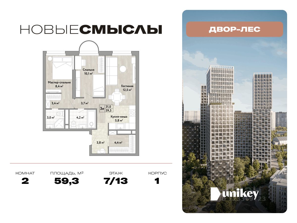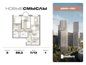 В жилом комплексе, расположенном по соседству с ландшафтным парком "Южное Бутово", продается 2-комнатная квартира площадью 59.30 кв. м. с отделкой. Квартира расположена на 7 этаже 1 корпуса в жилом квартале комфорт-класса "Новые Смыслы" (ГК Unikey/Юникей).