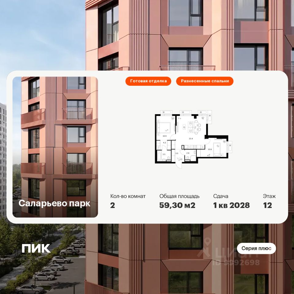 Продаётся 2-комн. квартира площадью 59,4 кв.м на 12 этаже 18 этажного дома (Корпус 74.6, Секция 6) проекта ПИК Саларьево парк. Светлый просторный подъезд на уровне земли, функциональная планировка, большие окна, c отделкой.