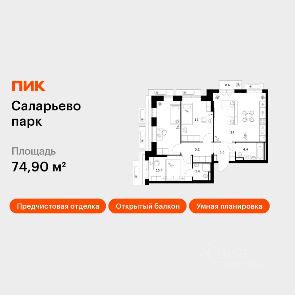 Продаётся 3-комн. квартира площадью 74,9 кв.м на 3 этаже 22 этажного дома (Корпус 57.3, Секция 3) проекта ПИК Саларьево парк. Светлый просторный подъезд на уровне земли, функциональная планировка, большие окна, предчистовая отделка.