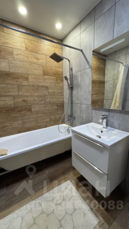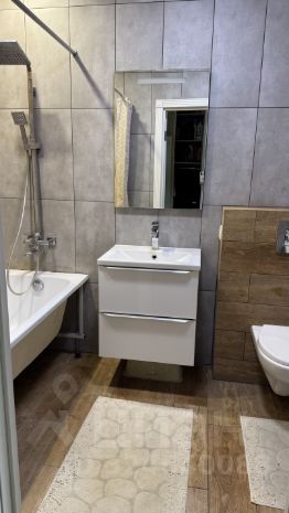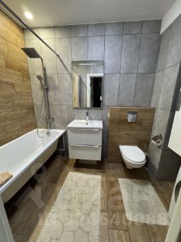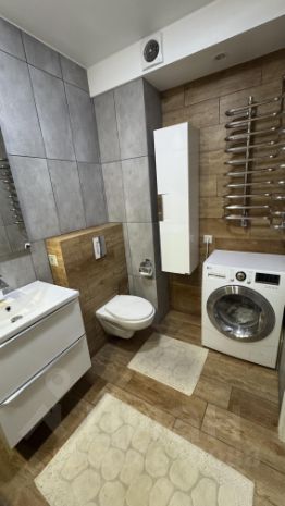 Просторный. Совмещенный. Имеются места для хранения как под раковиной, так и в навесном шкафчике. Унитаз встроенный, все его наполнение качественное дорогое.