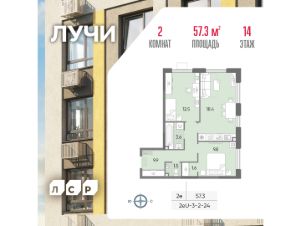 Продается 2-комнатная квартира общей площадью 57.3 кв. метров на 14 этаже жилого комплекса Лучи.