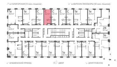 Продается квартира-студия общей площадью 22.2 кв. метров на 4 этаже жилого комплекса Дмитровское небо. Комплекс возводится в Северном административном округе в районе Западное Дегунино в Ильменском проезде, в 5 минутах ходьбы от метро "Верхние Лихоборы", а автомобилисты могут за пару минут выехать на Ильменский проезд и по нему добраться до Дмитровского шоссе.