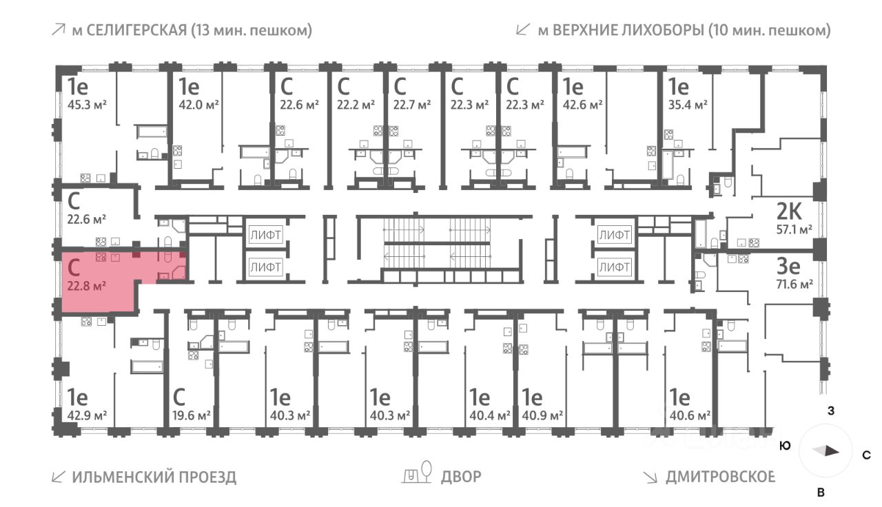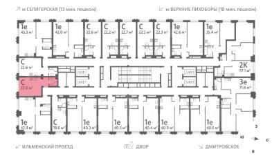 Продается квартира-студия общей площадью 22.8 кв. метров на 4 этаже жилого комплекса Дмитровское небо. Комплекс возводится в Северном административном округе в районе Западное Дегунино в Ильменском проезде, в 5 минутах ходьбы от метро "Верхние Лихоборы", а автомобилисты могут за пару минут выехать на Ильменский проезд и по нему добраться до Дмитровского шоссе.