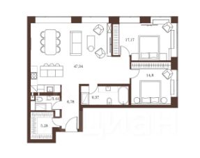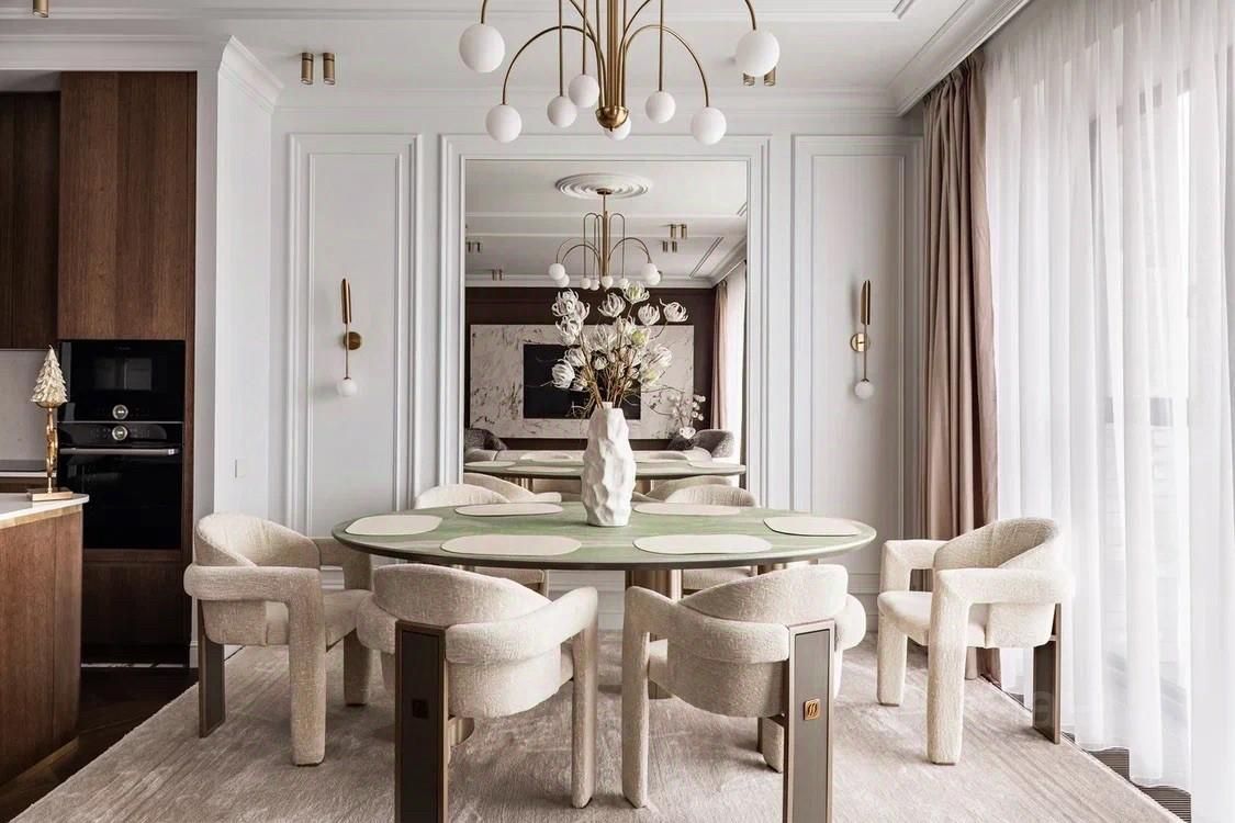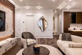 • Просторная эстетичная кухня-гостиная 47,3 м² с широкими панорамными окнами в уютный двор комплекса.
