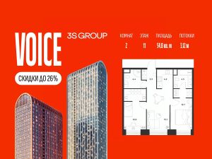 Продается уютная 2-комн. квартира площадью 54,8 кв.м на 11 этаже жилого комплекса бизнес-класса Войс от 3S Group. Общая площадь: 54,8 кв.м., жилая: 38,4 кв.м., площадь кухни-гостиной: 17,6 кв.м., высокие потолки: 3,12 м., санузел совмещенный.
