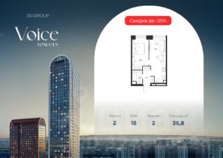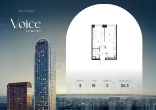 Продается уютная 1-комн. квартира площадью 35,8 кв.м на 18 этаже жилого комплекса бизнес-класса Voice Towers от 3S Group. Общая площадь: 35,8 кв.м., жилая: 23,1 кв.м., площадь кухни-гостиной: 17,3 кв.м., высокие потолки: 3,12 м., санузел совмещенный.