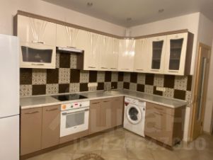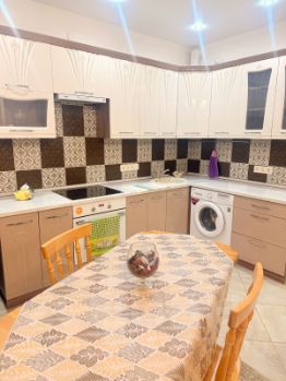 в наличии: кухонный гарнитур, обеденный стол со стульями, кровать, диван, холодильник, стиральная машина.