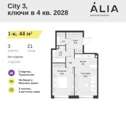 Продаётся 1-комнатная квартира 44 м². В жилом районе ALIA на 21-м этаже 30-этажного дома.