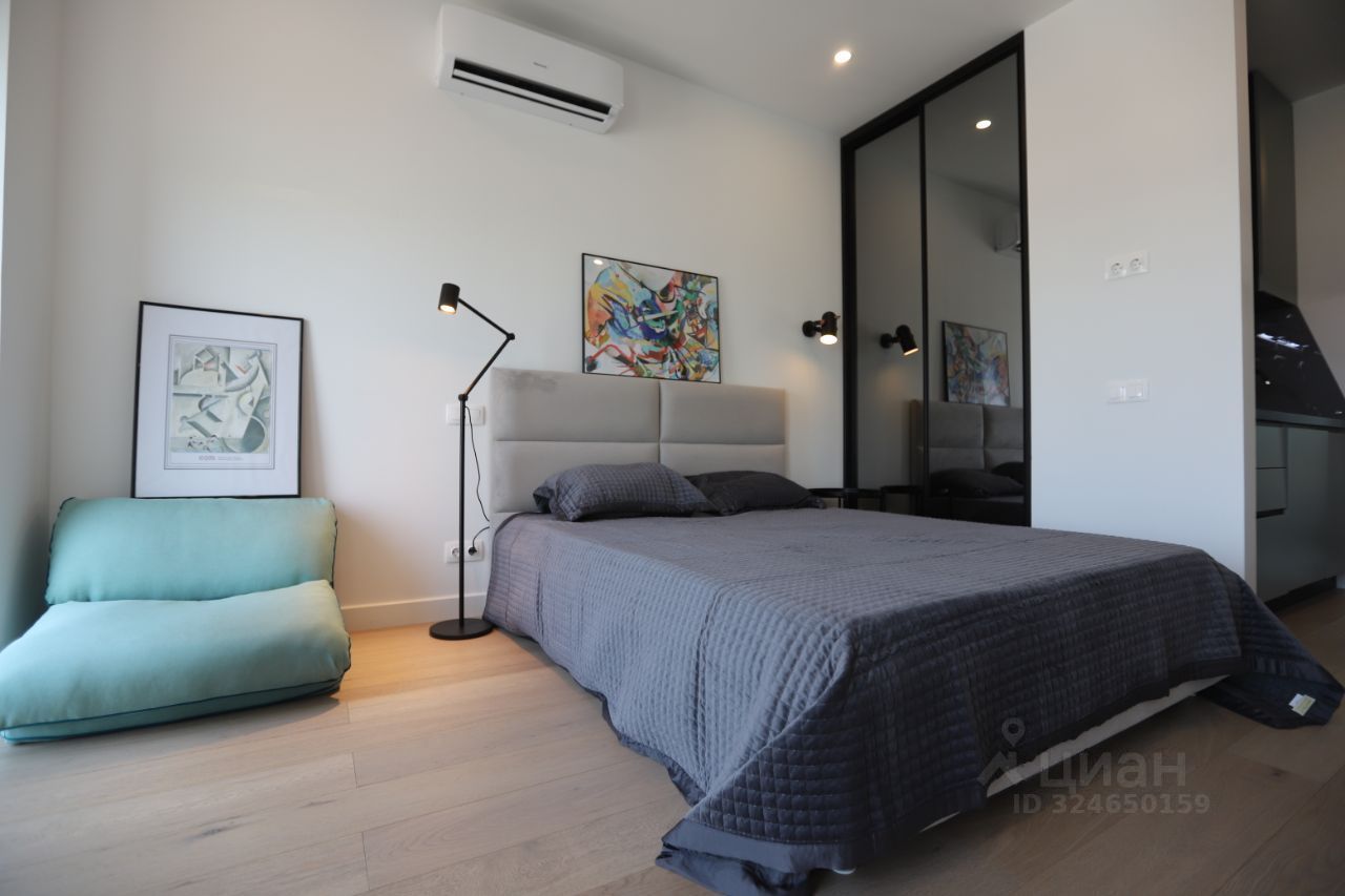 =выполнен качественный ремонт. Светлая кухня-гостиная с панорамными окнами и французским балконом оборудована встроенной мебелью и техникой ведущих производителей. В спальной зоне большая кровать с ортопедическим матрасом, вместительные встроенные шкафы. Большой санузел. Установлен кондиционер, есть подогрев пола и проточный нагреватель воды.