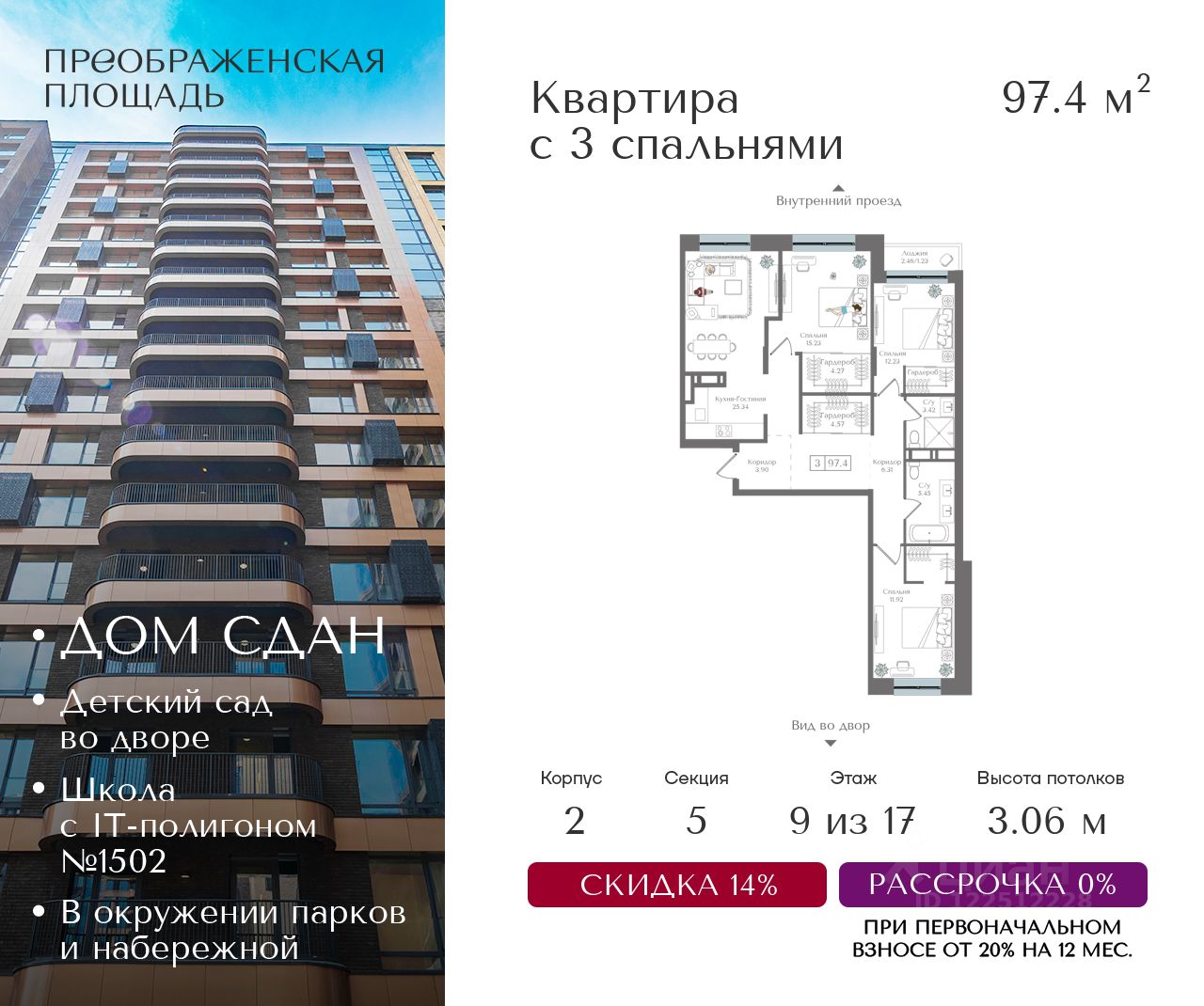 Квартира на 9 этаже в жилом комплексе премиум-класса "Преображенская площадь". Общая площадь: 97.4 кв.м.