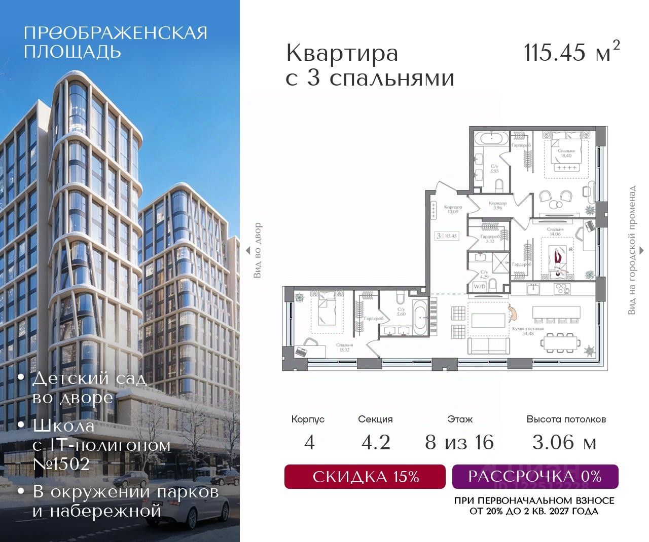 Квартира на 8 этаже в жилом комплексе премиум-класса "Преображенская площадь". Общая площадь: 115.45 кв.м.