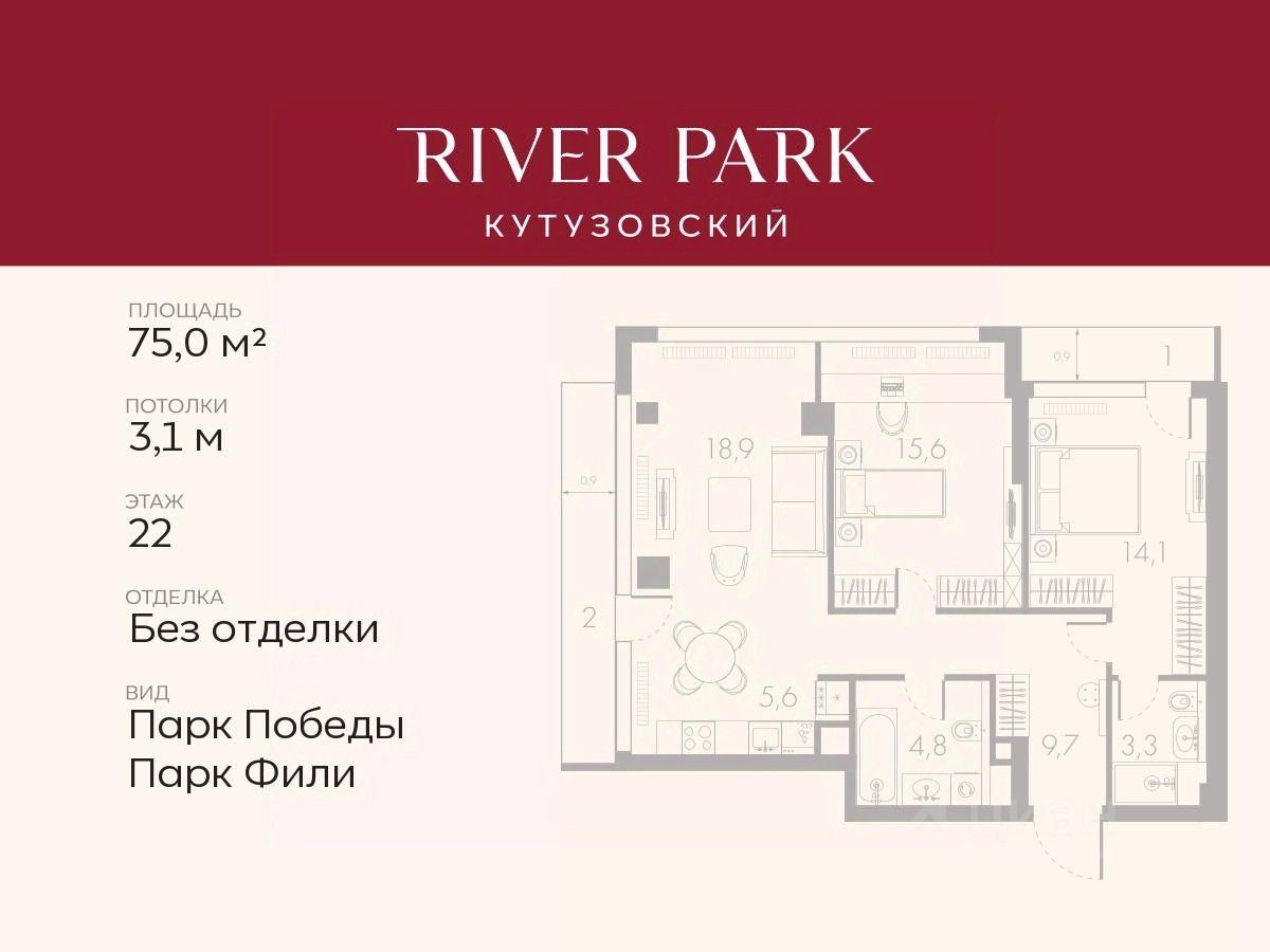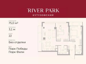 Продается 2-к квартира площадью 75.0 кв.м. на 22-м этаже в жилом комплексе премиум-класса River Park Кутузовский в Башне Lazur Tower
