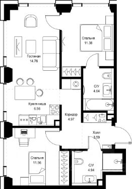 В ЖК SET продается 2-комнатная квартира площадью 62.40 м², расположенная в корпусе Б, на 17 этаже 59 этажного дома.