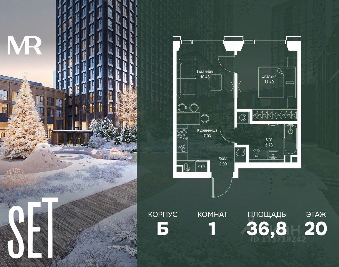В ЖК SET продается 1-комнатная квартира площадью 36.82 м², расположенная в корпусе Б, на 20 этаже 59 этажного дома.