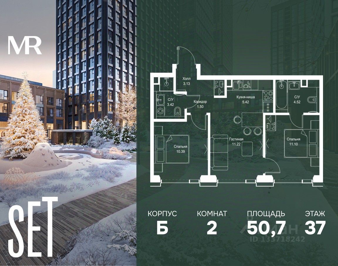В ЖК SET продается 2-комнатная квартира площадью 50.70 м², расположенная в корпусе Б, на 37 этаже 59 этажного дома.