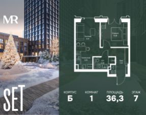 В ЖК SET продается 1-комнатная квартира площадью 36.30 м², расположенная в корпусе Б, на 7 этаже 59 этажного дома.