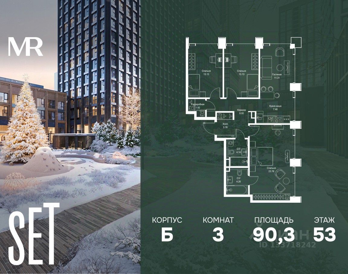 В ЖК Сет продается 3-комнатная квартира площадью 90.31 м², расположенная в корпусе Б, на 53 этаже 59 этажного дома.