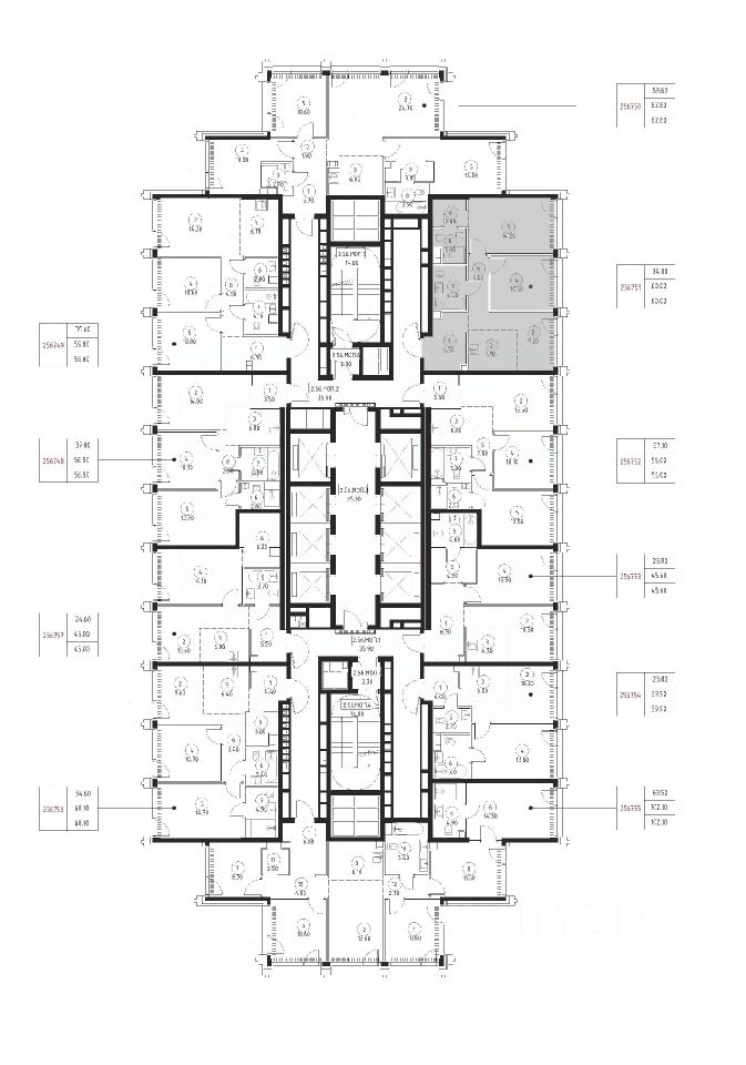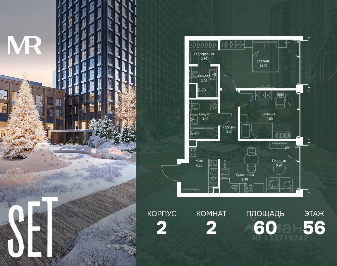 В ЖК SET продается 2-комнатная квартира площадью 60 м², расположенная в корпусе 2, на 56 этаже 59 этажного дома.