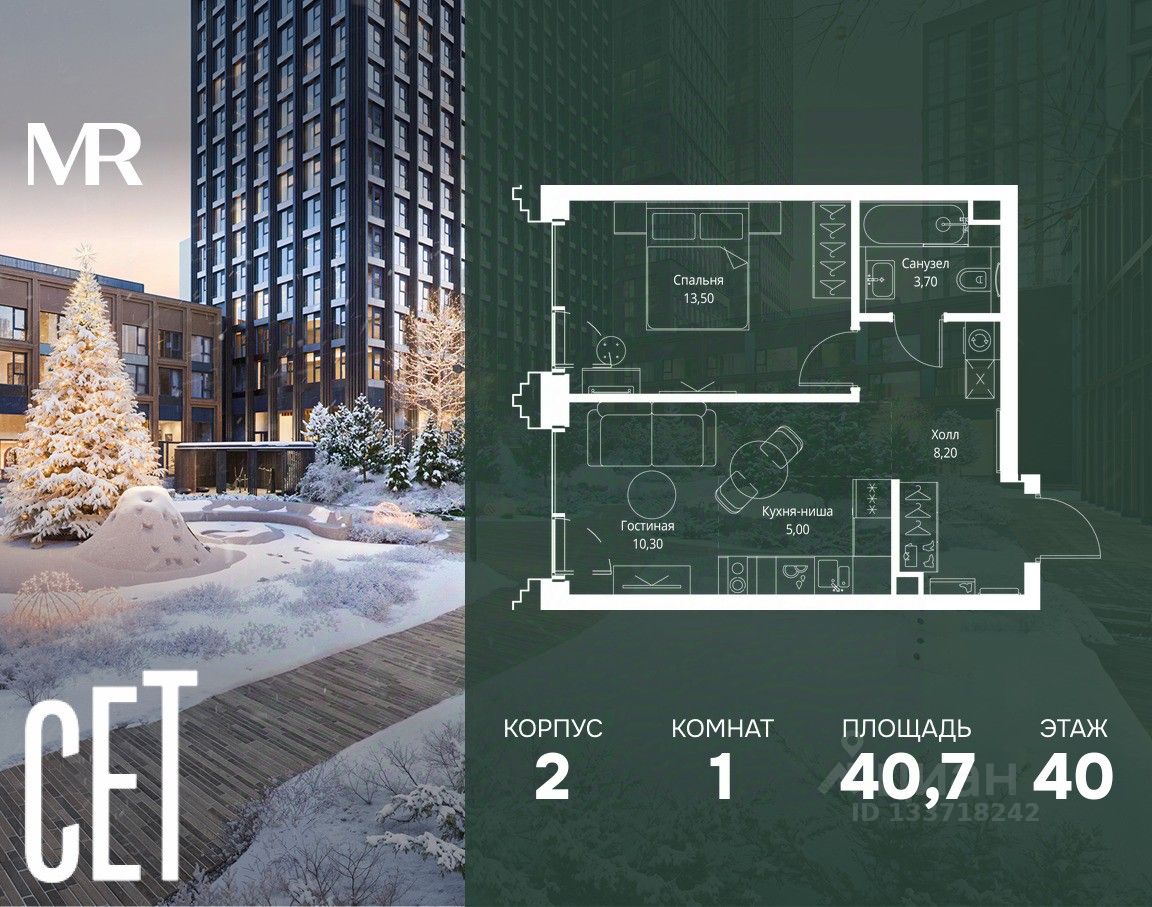 В ЖК Сет продается 1-комнатная квартира площадью 40.70 м², расположенная в корпусе 2, на 40 этаже 59 этажного дома.