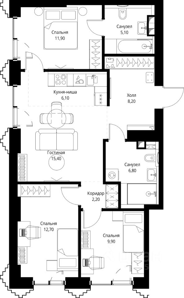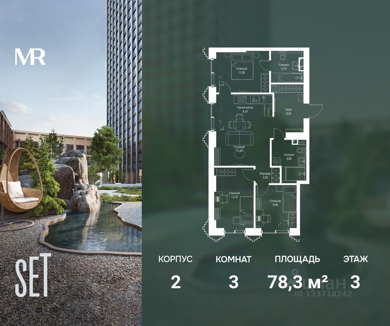 В ЖК SET продается 3-комнатная квартира площадью 78.30 м², расположенная в корпусе 2, на 3 этаже 59 этажного дома.