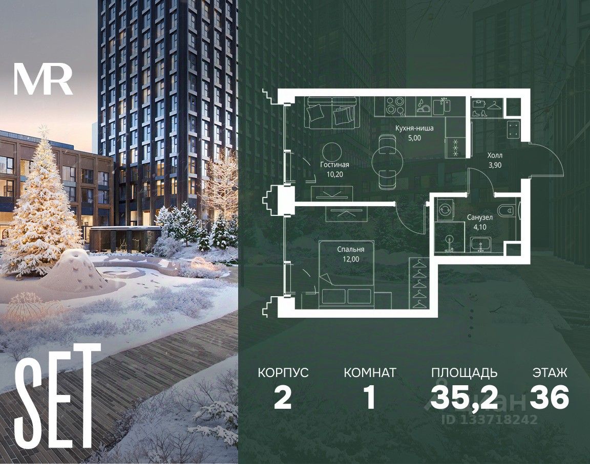 В ЖК SET продается 1-комнатная квартира площадью 35.20 м², расположенная в корпусе 2, на 36 этаже 59 этажного дома.