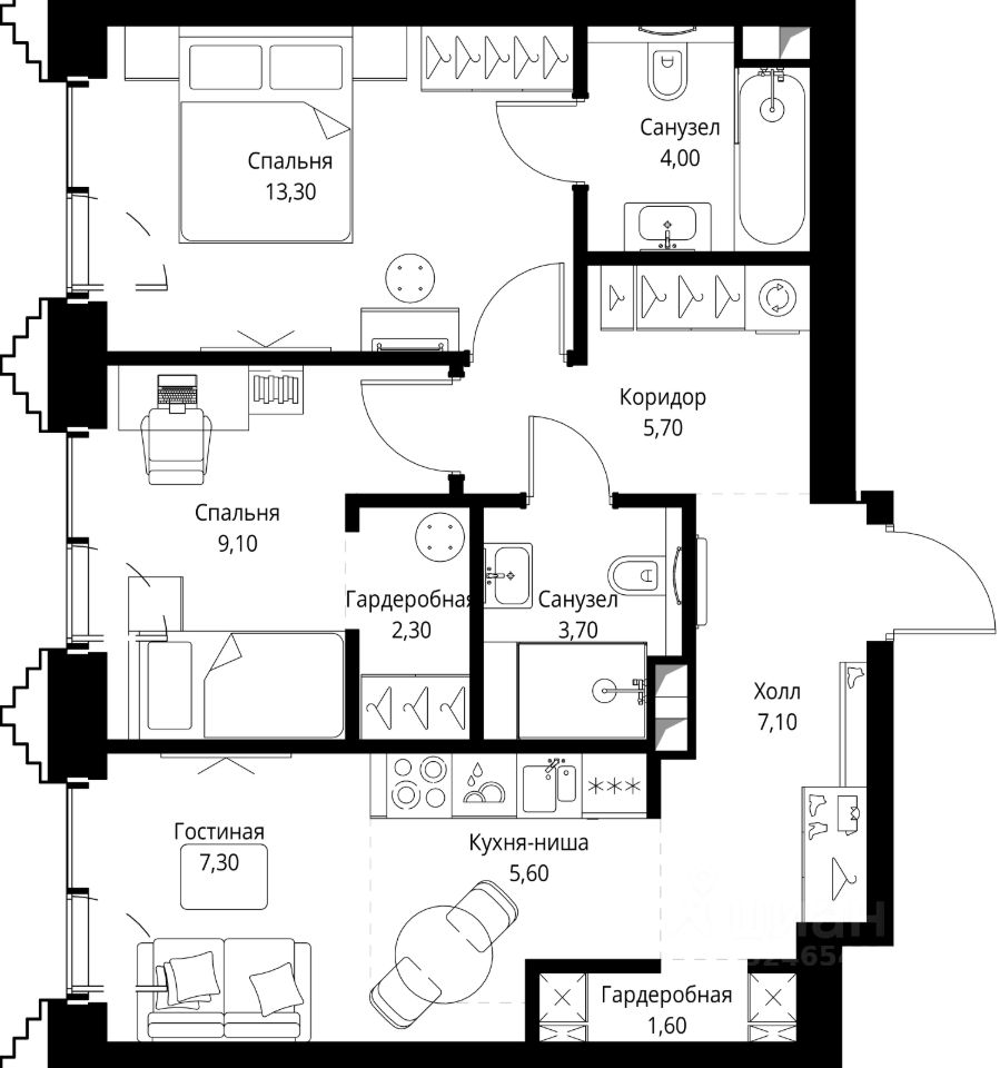 В ЖК Сет продается 2-комнатная квартира площадью 59.70 м², расположенная в корпусе 2, на 3 этаже 59 этажного дома.