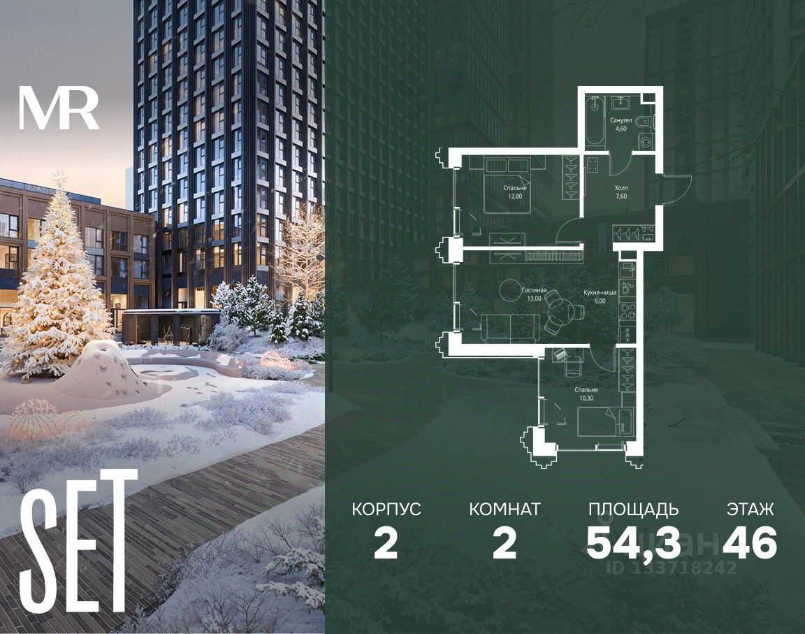 В ЖК Сет продается 2-комнатная квартира площадью 54.30 м², расположенная в корпусе 2, на 46 этаже 59 этажного дома.