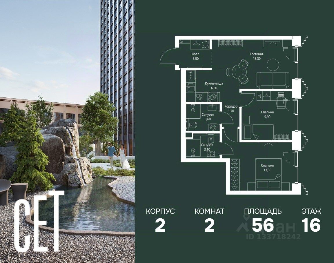 В ЖК Сет продается 2-комнатная квартира площадью 56 м², расположенная в корпусе 2, на 16 этаже 59 этажного дома.