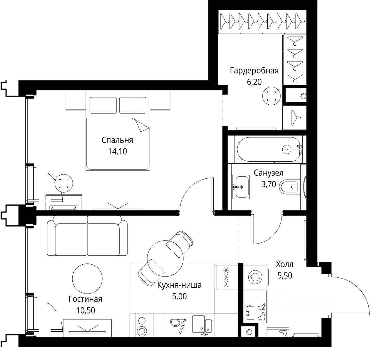В ЖК SET продается 1-комнатная квартира площадью 45 м², расположенная в корпусе 2, на 59 этаже 59 этажного дома.
