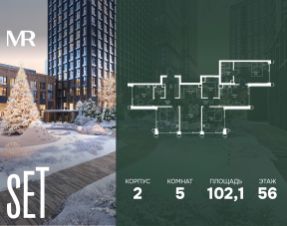 В ЖК SET продается 5-комнатная квартира площадью 102.10 м², расположенная в корпусе 2, на 56 этаже 59 этажного дома.