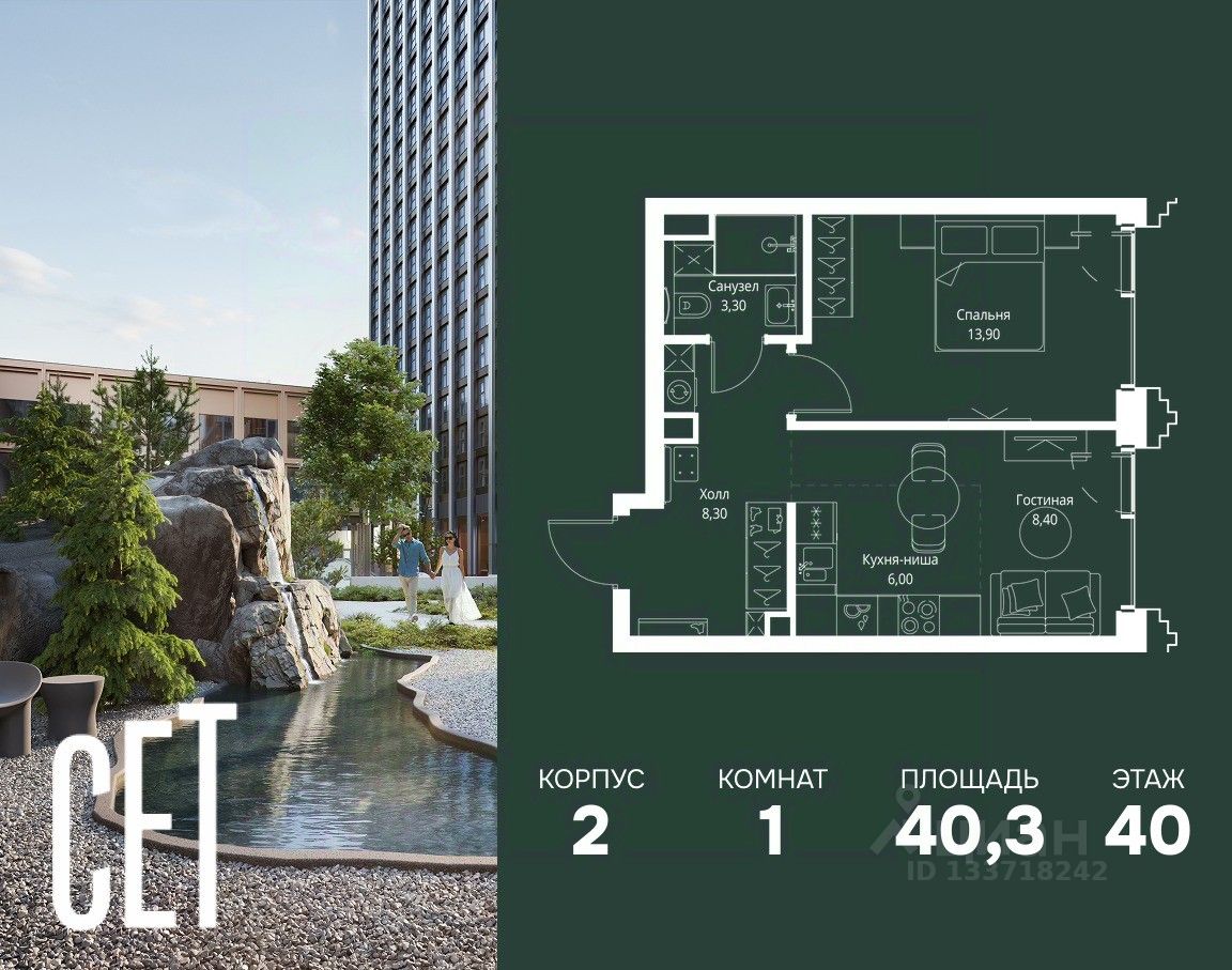 В ЖК Сет продается 1-комнатная квартира площадью 40.30 м², расположенная в корпусе 2, на 40 этаже 59 этажного дома.