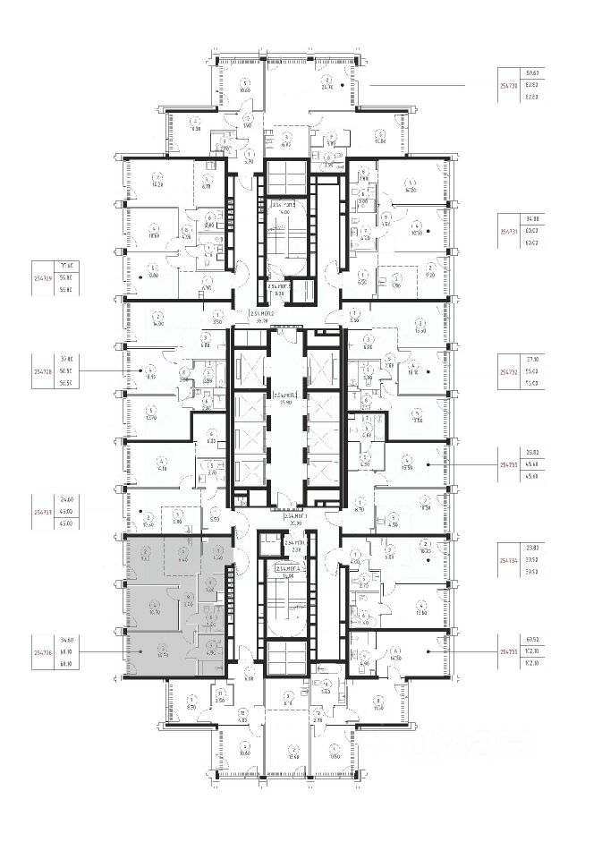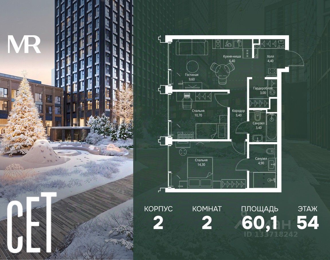В ЖК Сет продается 2-комнатная квартира площадью 60.10 м², расположенная в корпусе 2, на 54 этаже 59 этажного дома.