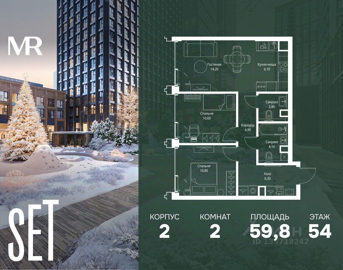 В ЖК SET продается 2-комнатная квартира площадью 59.80 м², расположенная в корпусе 2, на 54 этаже 59 этажного дома.