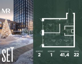 В ЖК SET продается 1-комнатная квартира площадью 41.40 м², расположенная в корпусе 2, на 22 этаже 59 этажного дома.
