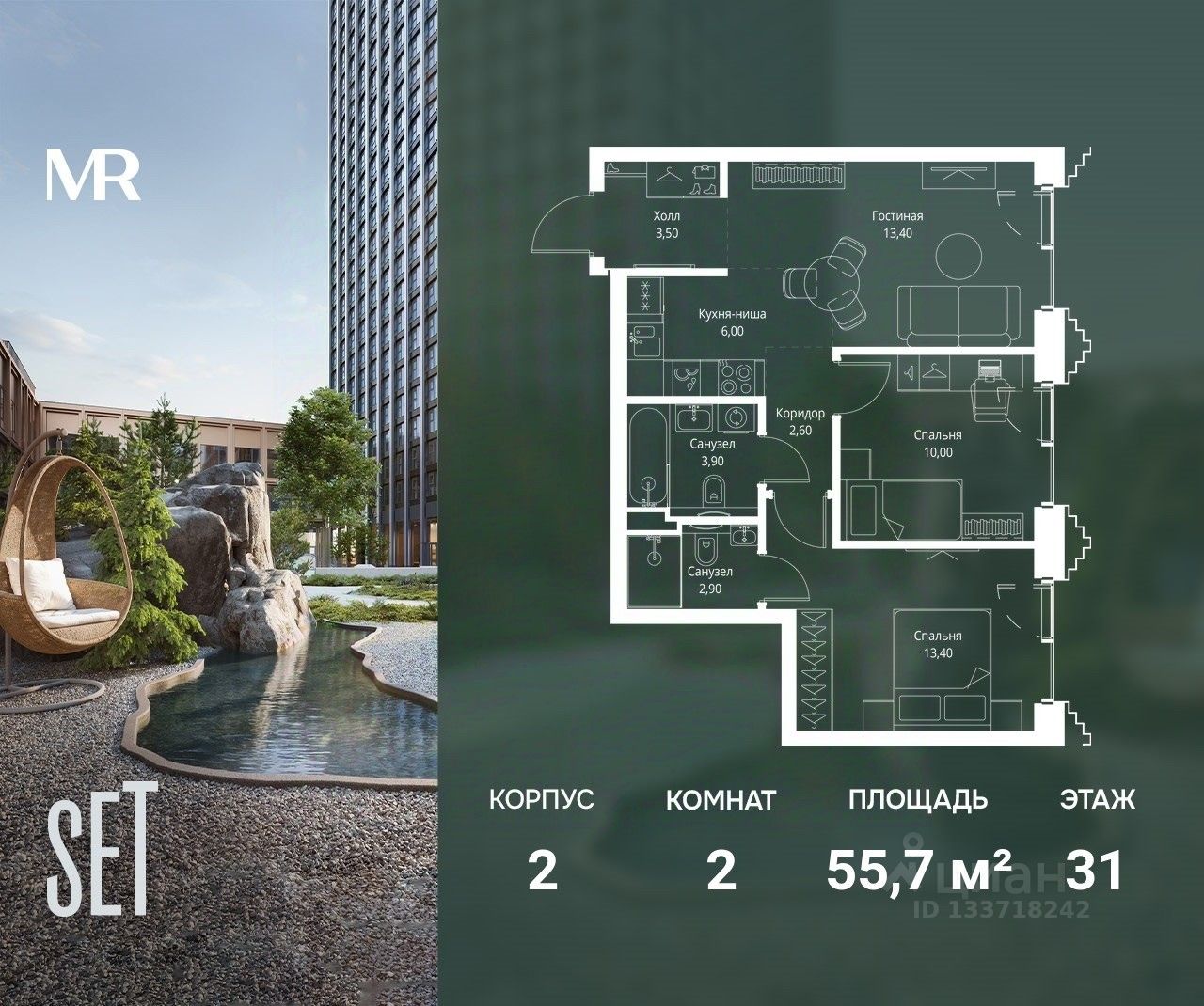 В ЖК SET продается 2-комнатная квартира площадью 55.70 м², расположенная в корпусе 2, на 31 этаже 59 этажного дома.