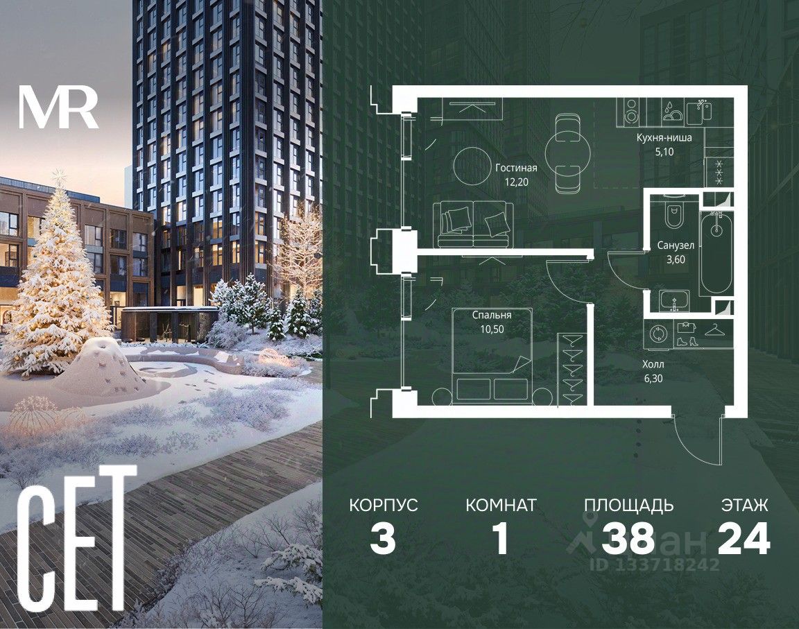 В ЖК Сет продается 1-комнатная квартира площадью 38 м², расположенная в корпусе 3, на 24 этаже 45 этажного дома.