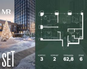 В ЖК SET продается 2-комнатная квартира площадью 62.80 м², расположенная в корпусе 3, на 6 этаже 45 этажного дома.