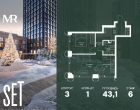 В ЖК SET продается 1-комнатная квартира площадью 43.10 м², расположенная в корпусе 3, на 6 этаже 45 этажного дома.