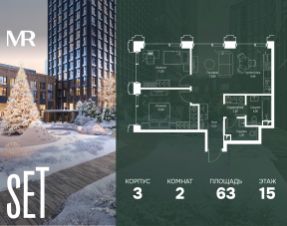 В ЖК SET продается 2-комнатная квартира площадью 63 м², расположенная в корпусе 3, на 15 этаже 45 этажного дома.