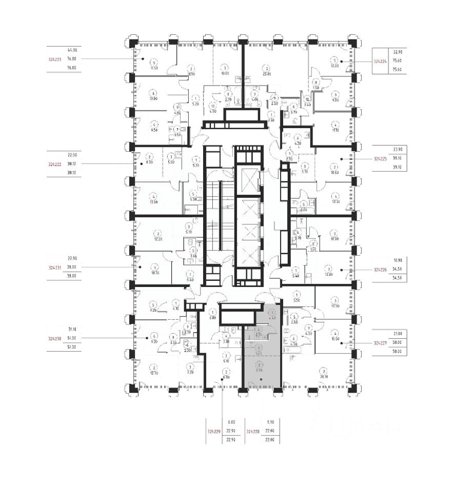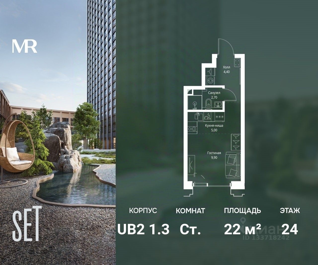 В ЖК SET продается студия площадью 22 м², расположенная в корпусе 3, на 24 этаже 45 этажного дома.