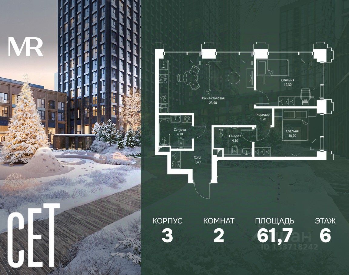 В ЖК Сет продается 2-комнатная квартира площадью 61.70 м², расположенная в корпусе 3, на 6 этаже 45 этажного дома.