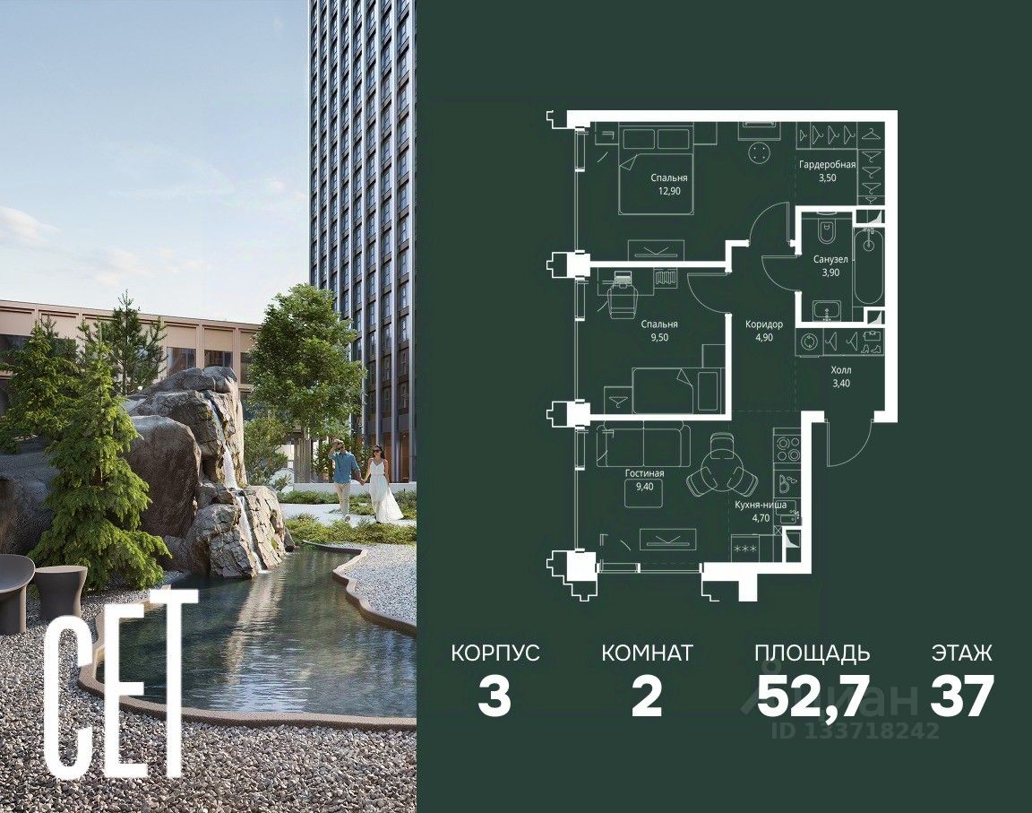 В ЖК Сет продается 2-комнатная квартира площадью 52.70 м², расположенная в корпусе 3, на 37 этаже 45 этажного дома.