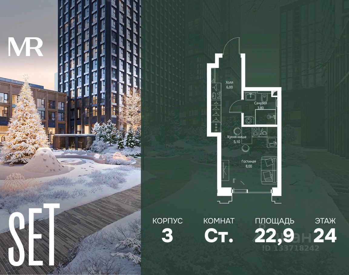 В ЖК SET продается студия площадью 22.90 м², расположенная в корпусе 3, на 24 этаже 45 этажного дома.