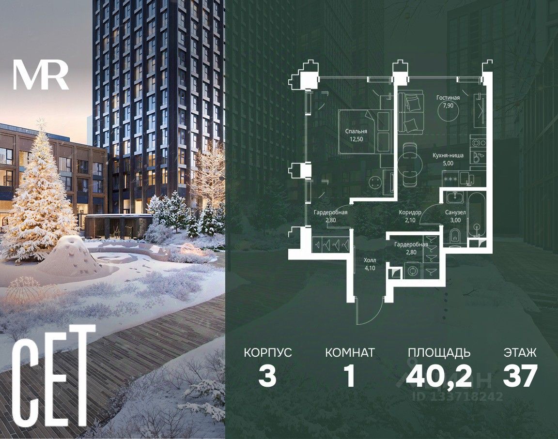 В ЖК Сет продается 1-комнатная квартира площадью 40.20 м², расположенная в корпусе 3, на 37 этаже 45 этажного дома.