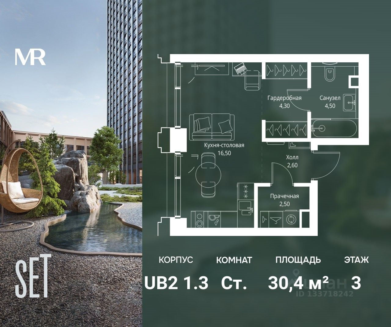 В ЖК SET продается студия площадью 30.40 м², расположенная в корпусе 3, на 3 этаже 45 этажного дома.